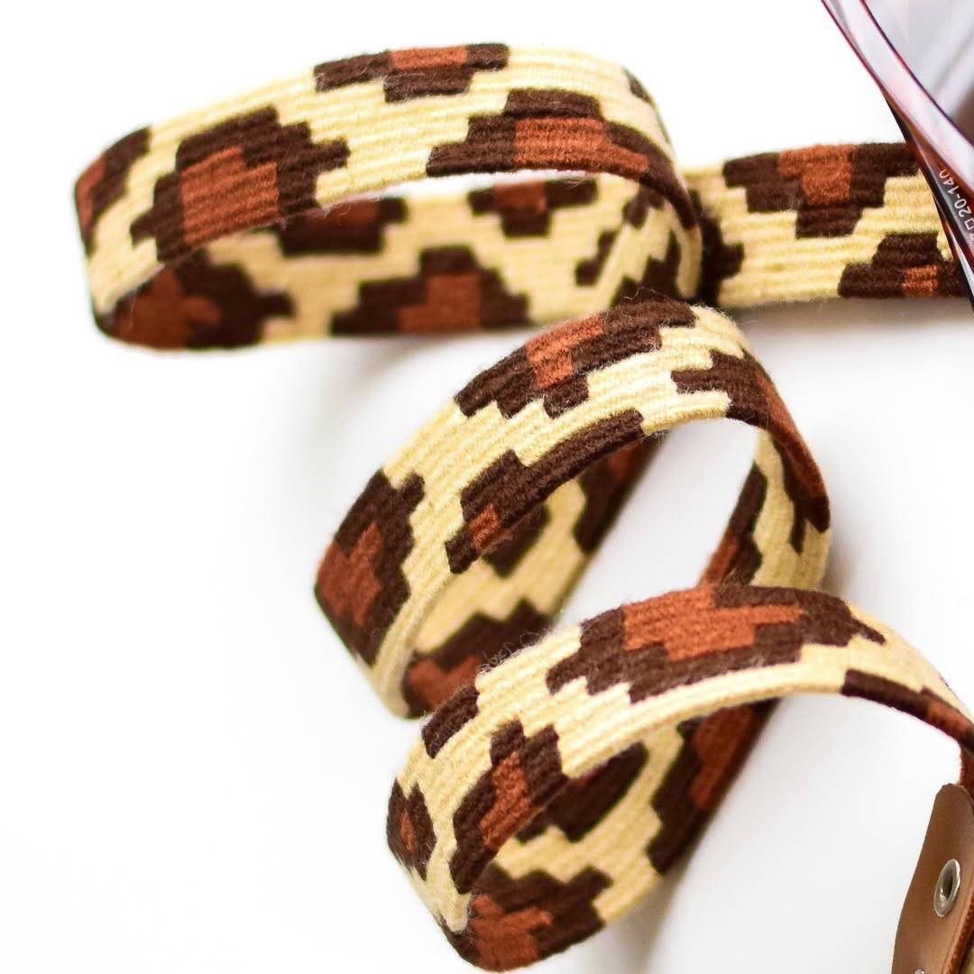 بافت گلیم و کاملا کار دست، چرم طبیعی با یراق آلات رنگ ثابت، بافت نرم و بدون حساسیت و قابل شستشو. عرض ٢ سانت طول حدودا ٨۵